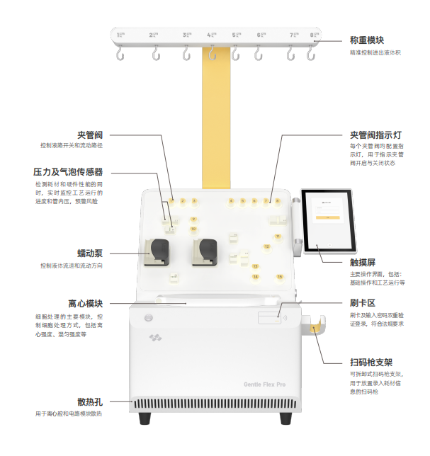 Gentle Flex Pro 高通量多功能全封閉自動化細胞處理系統是一款全自動化、封閉化、數字化、柔性化的細胞處理設備,針對實體瘤應用及通用型細胞治療產品,實現大體積細胞濃縮清洗及分裝制劑。同時也兼容 PBMC 分離,細胞磁珠孵育清洗等功能。