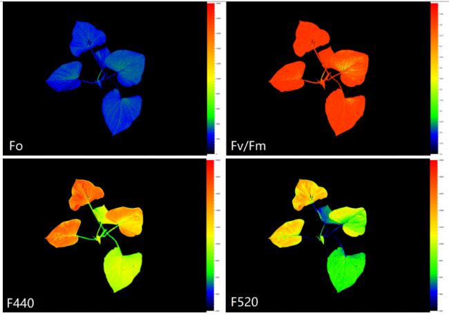 在培訓(xùn)現(xiàn)場(chǎng)技術(shù)人員利用該系統(tǒng)對(duì)甘薯葉進(jìn)行葉綠素?zé)晒獬上穹治龊蚒V紫外激發(fā)多光譜成像測(cè)量分析,下圖展示了結(jié)果中的Fo、Fv/Fm以及F440、F520成像圖。