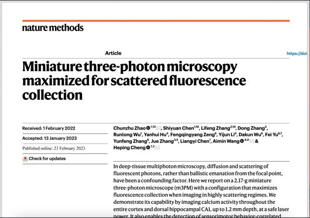 2023年2月23日,北京大學程和平-王愛民團隊在Nature Methods在線發表題為 Miniature three-photon microscopy maximized for scattered fluorescence collection的文章。