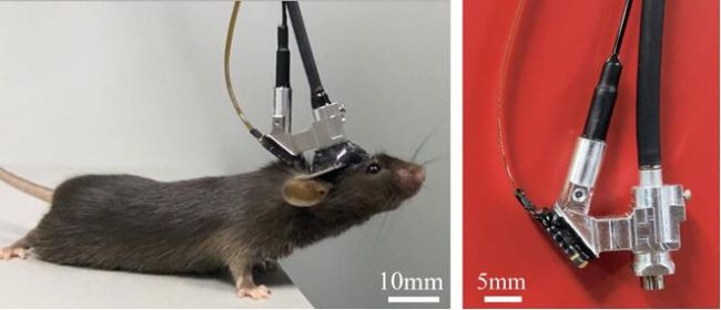 圖1 小鼠佩戴微型化三光子顯微鏡實景圖
