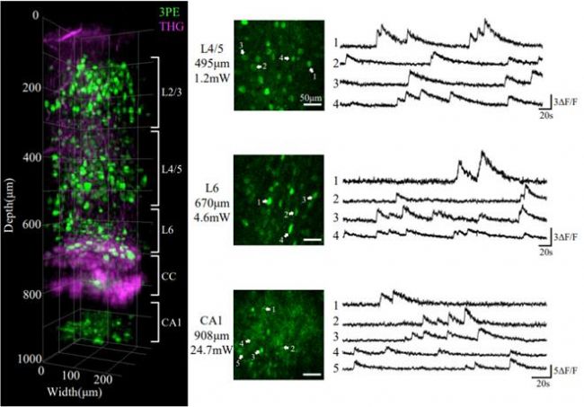 此次,北京大學最新研發的微型化三光子顯微鏡一舉突破了此前微型化多光子顯微鏡的成像深度極限: