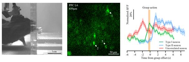video3:左圖是佩戴著微型化三光子顯微鏡的小鼠在0.5厘米狹縫中用手抓取糖豆吃。中間圖是此時微型化三光子顯微鏡探頭拍攝的PPC腦區皮層第6層神經元(位于650微米深度)熒光鈣信號(GCaMP6s標記的神經元,幀率15.93 Hz)。右圖是選取中間圖中5個神經元的鈣活動軌跡,其中每條綠線表示一次小鼠的抓取動作。移動的藍色線與左圖的小鼠行為視頻以及中間圖中的神經元活動同步。視頻以正常(×1)、慢速(×0.5)和快速(×10)的速度播放,以便于查看抓取行為。