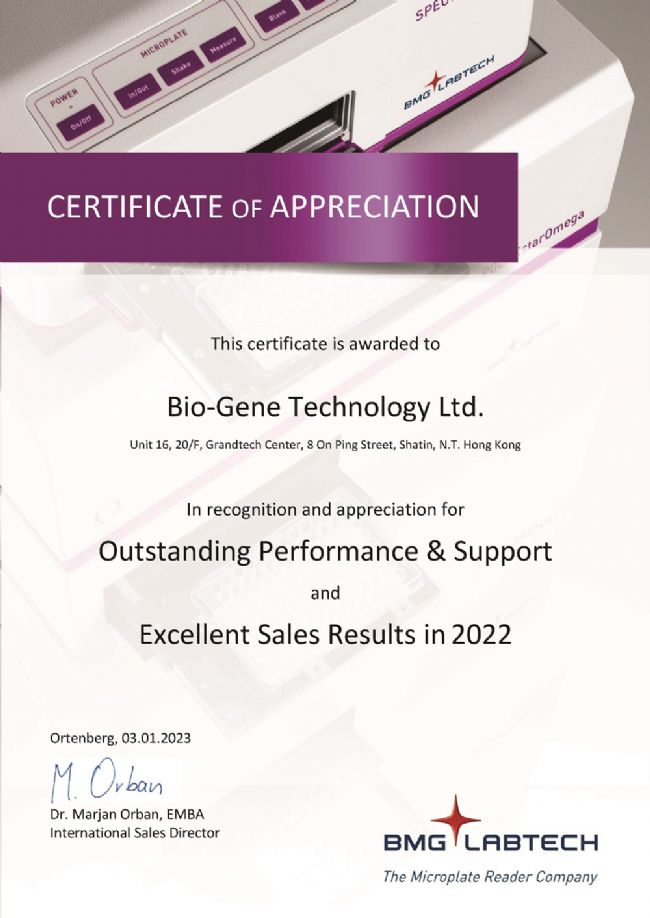 近日伯齊科技榮獲德國BMG LABTECH廠家授予的“2022年度優秀表現與銷售大獎”!伯齊科技作為BMG LABTECH多功能酶標儀中國獨家代理商,于2022年取得了非常出色的成績,無論是銷售還是在售后服務上,都得到了BMG LABTECH廠家的高度贊許和肯定!伯齊科技已第七次獲得了該獎項,給予我們極大的信心和鼓勵!這不僅展示了BMG LABTECH與伯齊科技的強強聯合,共同發展,而且將更有力的激勵伯齊科技繼續努力再創佳績!