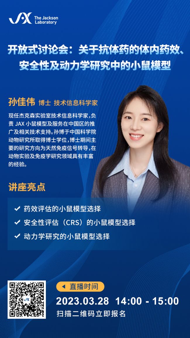 3月28日,下午14:00-15:00,杰克森實驗室技術信息科學家孫佳偉博士將為大家帶來【開放式討論會: 關于抗體藥的體內藥效、安全性及動力學研究中的小鼠模型】的線上直播講座。