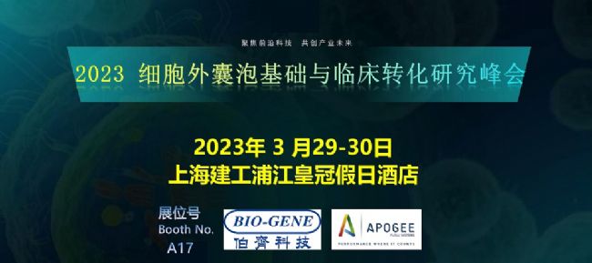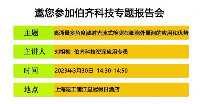 本次展會,伯齊科技作為英國Apogee在中國的全國代理商將攜手Apogee共同參加并贊助此次展會。同時,在3月30日14:30-14:50上海建工浦江皇冠假日酒店,由伯齊科技有限公司資深應用專員劉祖梅為大家帶來“高通量多角度散射光流式檢測在細胞外囊泡的應用和優勢”的學術報告。現場答疑解惑,歡迎感興趣的專家學者前往參加!