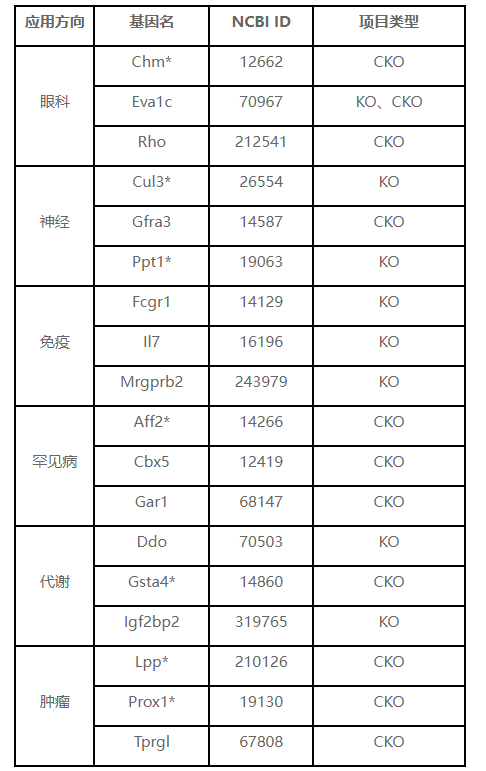 * 該基因編輯模型可能會出現不育或純合致死的情況,可根據對應MGI的編號進一步查詢。