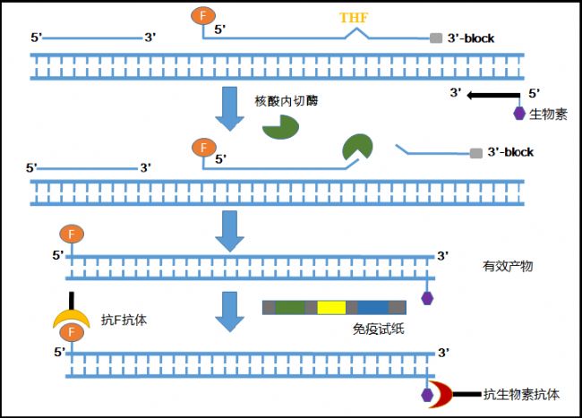 重組酶介導鏈置換核酸擴增(Recombinase-aid Amplification,RAA),是一種恒溫核酸快速擴增技術。RT-RAA先利用逆轉錄酶將 RNA 逆轉錄成 cDNA,從細菌或真菌中獲得的重組酶在常溫下可與引物DNA緊密結合,形成重組酶/引物復合體,侵入RNA-cDNA雙鏈核酸模板,在侵入位點重組酶將雙鏈打開,同時單鏈結合蛋白結合到被重組酶打開的單鏈上,維持雙鏈模板處于開鏈狀態。重組酶/引物復合體開始對雙鏈進行掃描,當引物在模板上搜索到與之完全匹配的互補序列時,重組酶/引物復合體解體,DNA聚合酶結合到引物的3'端,開始合成新鏈。合成的新鏈又可以作為模板,最終擴增產物以指數級增長,完成靶標基因的擴增。經過熒光標記的探針與擴增產物結合,當探針被核酸內切酶酶切后,與生物素標記的引物共同擴增形成兩端有熒光標記及生物素標記的片段,可用電泳法、熒光法或通用型核酸檢測試紙條進行判讀。如下圖所示: