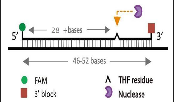 探針設計建議方法:探針長度在46-52 nt之間,序列避免回文序列、內部二級結構和連續的重復堿基;探針的5'端用一種抗原標記物標記,通常為FAM基團或羧基熒光素;內部含有堿基核苷酸類似物替換核苷酸(例如四氫呋喃殘基THF-有時稱為'dSpacer');3'末端有聚合酶延伸阻斷基團(例如C3-spacer,磷酸基或雙脫氧核苷酸)。如下圖所示: