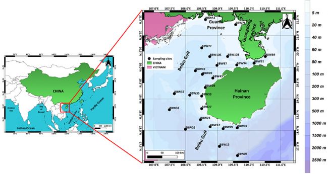 北部灣是位于南海西北部的半封閉海灣,不僅是中國四大傳統漁場之一,也是中國和東南亞漁業產業的縮影。近年來,由于該區域經濟的快速增長,工業污水、生活污水、海水養殖廢水等的加速排放,使該區域的生態環境問題從陸地擴散到了沿海海洋,導致該區域出現了不同程度的微塑料污染。目前該區域微塑料研究較少。