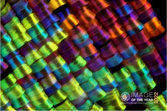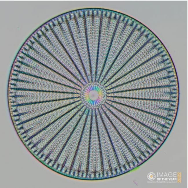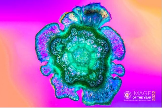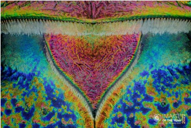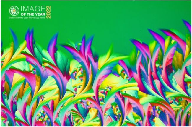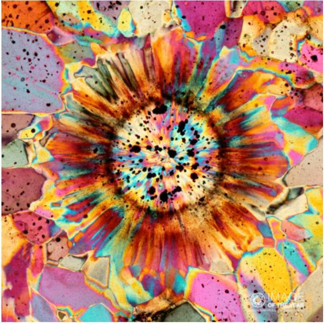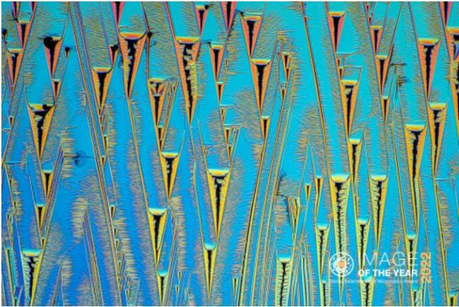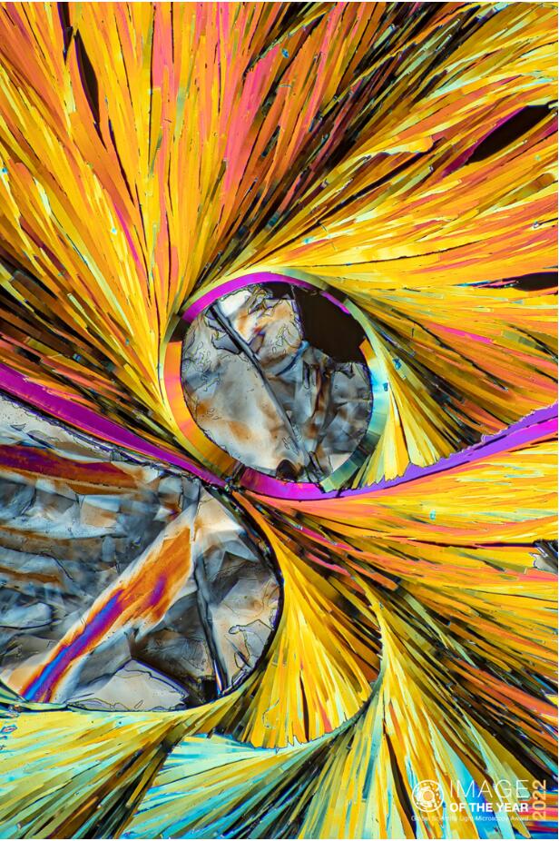 作品描述:這張圖片顯示了融化的月桂酸,再現(xiàn)比例為10倍/放大倍率約為120:1,使用偏光顯微鏡拍攝。為了做到這點(diǎn),我在顯微鏡載玻片上撒了一些月桂酸,用蓋玻片蓋住它并融化它。融化時(shí),確保熱板的溫度緩慢升高,直到物質(zhì)液化;如果開始時(shí)溫度太高,物質(zhì)可能會(huì)被烤焦。在混合物在載玻片和蓋玻片之間形成薄膜后,融化物質(zhì)在幾秒內(nèi)即開始結(jié)晶。即使在熔化幾天后,晶體也會(huì)繼續(xù)生長(zhǎng)并產(chǎn)生新的圖像。