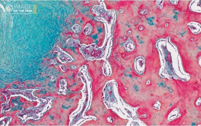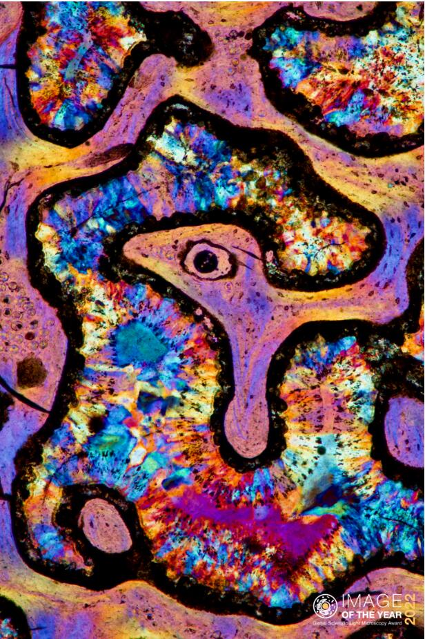 作品描述:在美國(guó)猶他州收集的恐龍骨片薄片。該圖像顯示了高度多孔的結(jié)構(gòu),孔隙中充滿了晚期玉髓,以及骨組織的化石殘余物,其中黑點(diǎn)用于容納單個(gè)骨細(xì)胞。