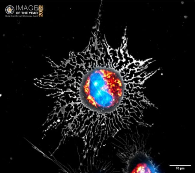 作品描述:這項(xiàng)工作顯示了花雄蕊尖端經(jīng)405nm,488nm和561nm激發(fā)得到的自發(fā)熒光,發(fā)出像孔雀羽毛一樣的藍(lán)綠色和翠綠色。