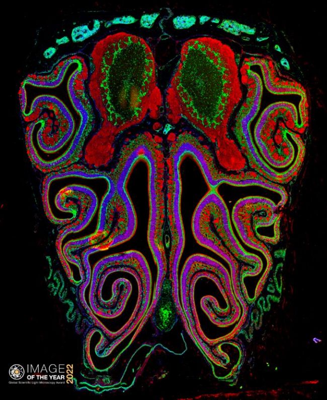 作品描述:該圖像顯示了固定成年小鼠鼻子的冠狀切片上的免疫熒光染色,揭示了嗅球(OB) - 圖像上部的兩個(gè)圓形結(jié)構(gòu) - 以及覆蓋內(nèi)壁的嗅上皮(OE)。