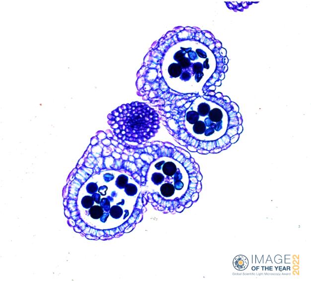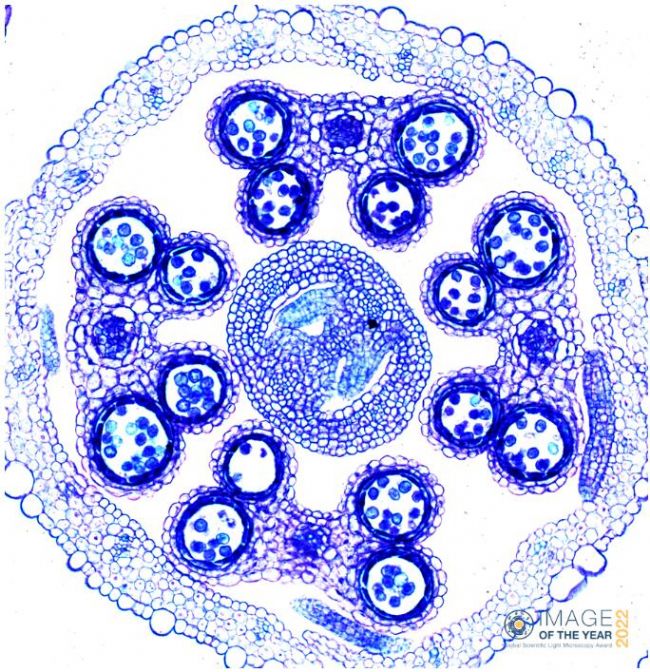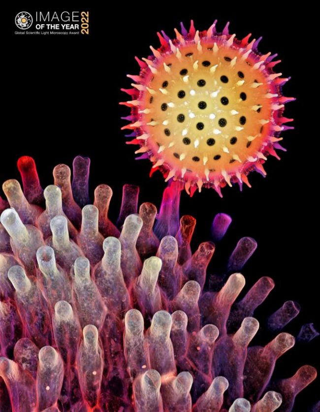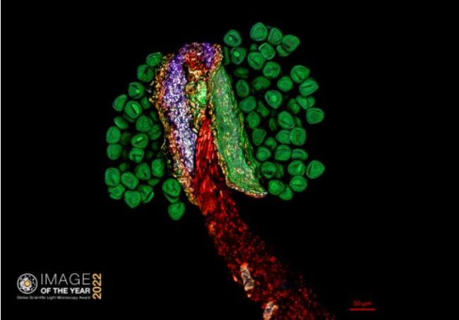 作品描述:收集蒲公英的雌蕊并制成載玻片樣品,利用其自發(fā)熒光特性通過(guò)共聚焦顯微鏡觀察其各部分的不同熒光圖案。