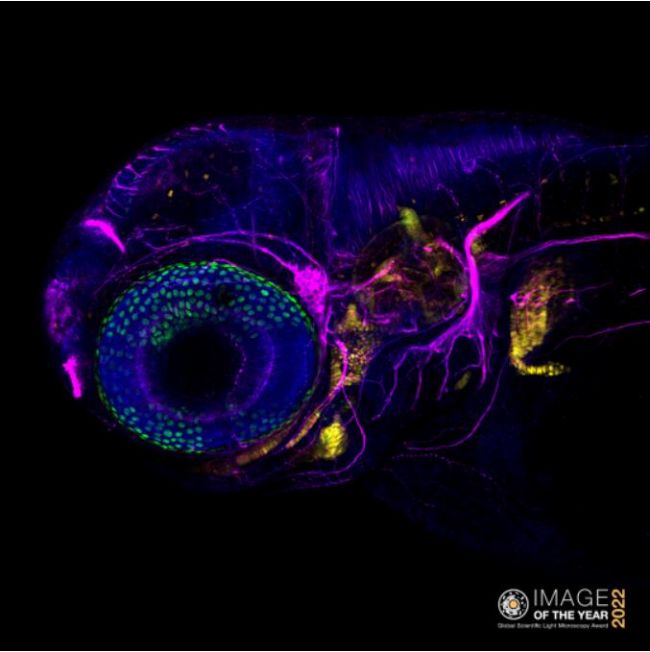 作品描述:海星幼蟲(Patiria miniata ,~1cm寬)的神經(jīng)系統(tǒng),在透明化處理后用針對(duì)乙酰化微管蛋白的抗體標(biāo)記,使用顏色編碼展示z軸亮度投影圖像。