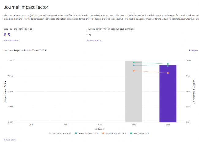 2023年6月28日,科睿唯安最新版的期刊引證報告(JCR2022)正式發布,《植物表型組學》(Plant Phenomics)影響因子6.5,位于農藝學一區(5/88名),植物科學一區(21/238名),遙感一區(7/33名)。