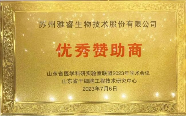 2023山東省醫學科研實驗室聯盟學術會議于7月7-9日在煙臺中澤華羿鉑爾曼酒店舉行,在頒獎盛典上,雅睿生物榮獲山東省醫學科研實驗室聯盟2023年學術會議、山東省干細胞工程技術研究中心頒發的“優秀贊助商”殊榮。
