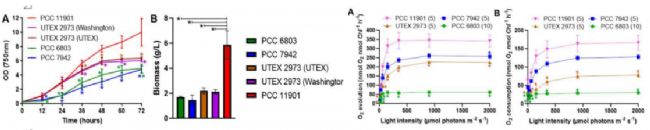 快速生長的藍藻聚球藻生物技術平臺的開發項目(Lauren A. Mills et al. 2022)中,應用MC1000監測 PCC 11901培養過程中OD變化,用以表征生物量變化。同時測量不同光強下、不同種類聚球藻的耗氧量,分析其光合呼吸(中國地質大學水資源與環境學院本次安裝的易科泰藻類培養與在線監測系統系統即可完成該實驗中所有參數的測量。)