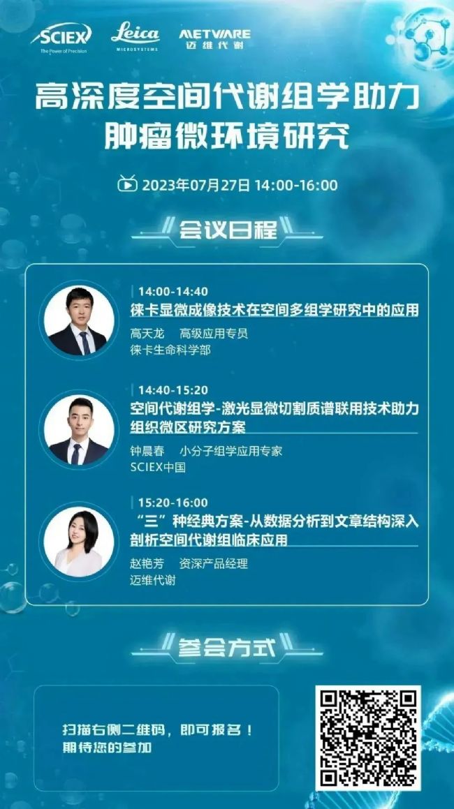空間多組學(xué)分析技術(shù)不斷革新,推動(dòng)了生命科學(xué)研究領(lǐng)域持續(xù)創(chuàng)新。為了促進(jìn)生命科學(xué)、精準(zhǔn)醫(yī)學(xué)、轉(zhuǎn)化醫(yī)學(xué)領(lǐng)域的技術(shù)交流,SCIEX中國(guó)、徠卡顯微系統(tǒng)、邁維代謝共同舉辦線上會(huì)議,探討高深度空間代謝組學(xué)新技術(shù)及腫瘤微環(huán)境研究新應(yīng)用,歡迎大家云端共聚。