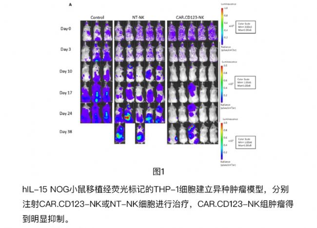 - 在hIL-15 NOG小鼠體內(nèi)可觀察到明顯的抗腫瘤作用(圖1),證明CAR.CD123-NK的有效性。