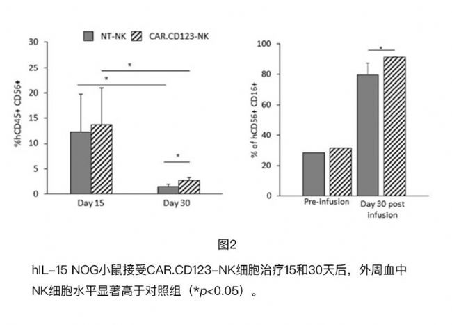 - NK細(xì)胞在IL-15的支持下可持續(xù)擴增,在體內(nèi)持續(xù)至少30天且無毒性,CAR.CD123-NK細(xì)胞水平顯著高于對照組(NT-NK)(圖2)。