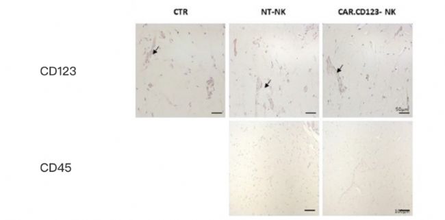 圖4:hIL-15 NOG小鼠人內(nèi)皮細(xì)胞組織免疫組化染色結(jié)果。CAR.CD123-NK組中可見內(nèi)皮組織重建(CD123),未見hCD45+細(xì)胞浸潤(代表NK細(xì)胞)。