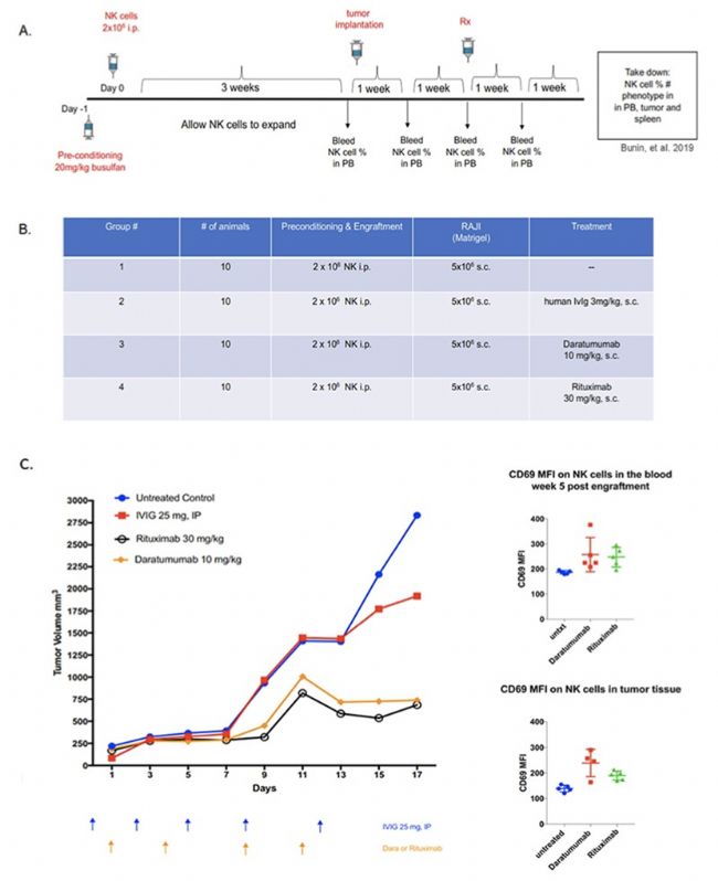 圖6:使用hIL-15 NOG移植純化NK細(xì)胞后,建立腫瘤模型后,分別給予Rituximab和Daratumumab兩種抗體藥物評價其ADCC效應(yīng)[5]。