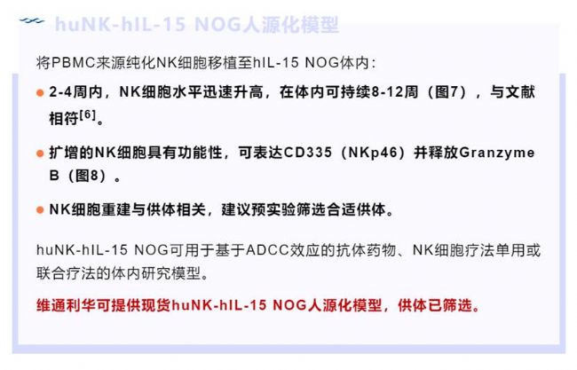 hIL-15 NOG小鼠可表達(dá)IL-15,進一步模擬人體內(nèi)免疫環(huán)境,支持移植NK細(xì)胞在小鼠體內(nèi)穩(wěn)定持續(xù)的擴增與功能性表達(dá)。維通利華也可提供huNK-hIL-15 NOG現(xiàn)貨模型(供體已篩選),用于NK細(xì)胞相關(guān)療法與藥物的ADCC效應(yīng)開發(fā)與評估。