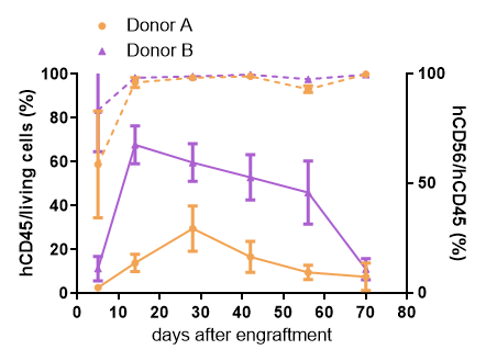 圖7:純化NK細(xì)胞移植到hIL-15 NOG體內(nèi),hCD45細(xì)胞和hCD56+NK細(xì)胞水平變化,NK細(xì)胞重建水平與供體有相關(guān)性