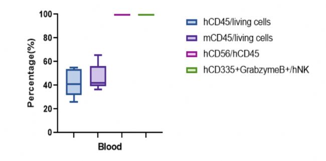 而使用傳統(tǒng)超重度免疫缺陷模型(NSG)建立的CDX模型,雖然可觀測到明顯的藥效,但在外周血中效應(yīng)細(xì)胞存續(xù)不足14天,且未檢測到相關(guān)細(xì)胞因子或毒素的釋放。