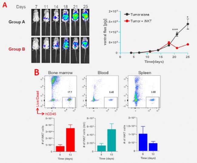 圖9:在hIL-15 NOG異種腫瘤模型中,給予iNKT細(xì)胞治療后腫瘤負(fù)荷明顯減少,動物外周血、骨髓中可檢測到iNKT細(xì)胞擴增