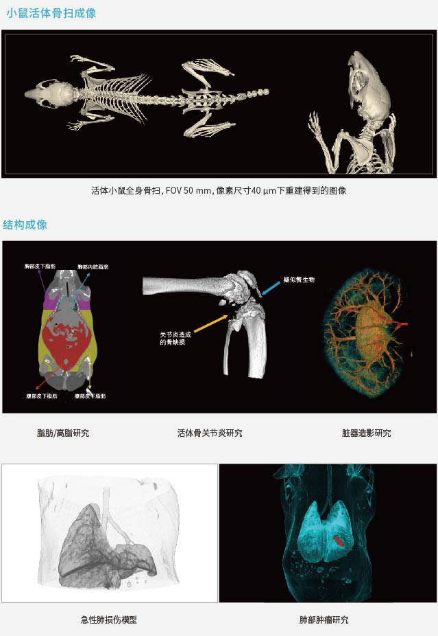 具有高分辨、大FOV的特性,既能實現離體樣本的高分辨率成像,又能滿足小動物活體的全身成像,是一臺集離體和活體掃描功能的一體化機型。廣泛應用于骨骼、器官、軟組織、腫瘤、心血管等相關結構變化研究,疾病的臨床前研究及相關藥物的臨床前研發。