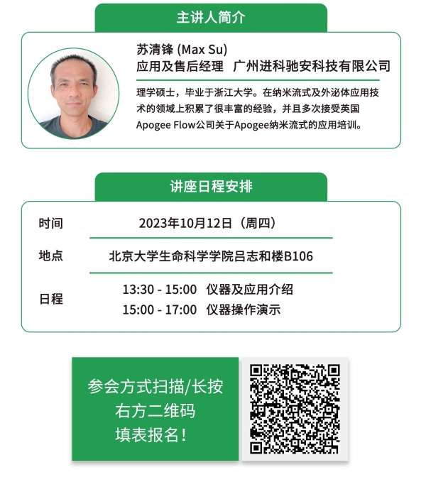 本次講座邀請廣州進科馳安科技有限公司資深應用及售后經理蘇清鋒,為您分享Apogee納米流式在納米顆粒分析中的優勢和典型應用,同時還有現場儀器操作演示,幫助老師們更好得了解Apogee納米流式的應用技術!歡迎感興趣的老師報名參加,共同交流分享!