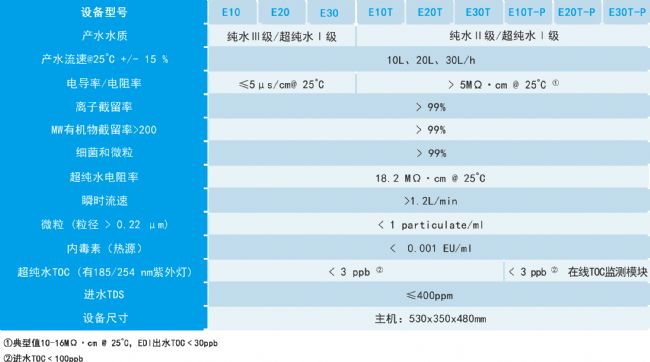 奧思德E系列超純水機,采用一體成型ABS機箱,智能化的微電腦操控系統及7寸LCD彩色電容觸摸屏,配有2.5m半徑可移動取水手臂,是一款實驗室中小超純水系統,結合了優良的預處理和先進的反滲透技術,以便捷、經濟的自來水為進水直接生產純水/超純水,產水量10-30L/h,純水電導率≤5μs/cm@ 25℃,超純水電阻率18.2MΩ·cm@ 25℃,TOC<3ppb,可選配高效EDI模塊,TOC在線檢測顯示功能,物聯網模塊,EDI純水電阻率>5MΩ·cm@ 25℃(典型值10-16MΩ·cm@ 25℃);適用于藥物研發及檢測實驗室,微生物檢測實驗室,痕量分析實驗室,實驗動物中心等。