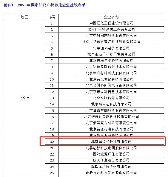 近日,國家知識產權局公示了2023年國家知識產權示范名單,北京慧榮和科技有限公司成功入選北京地區“2023年度國家知識產權示范企業”,成為該區域2023年度新上榜25家企業之一。
