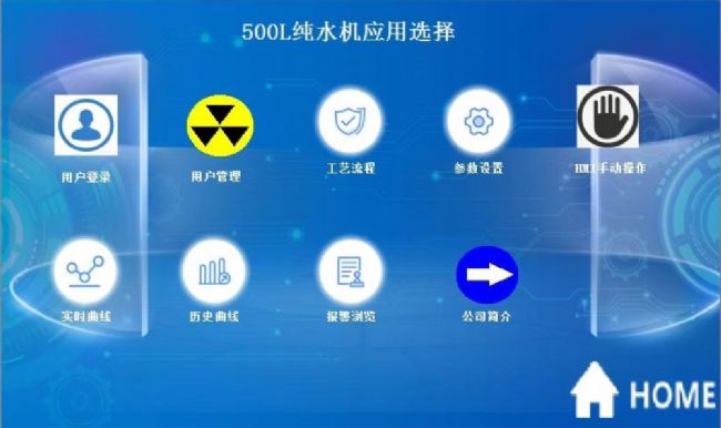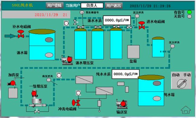 電控部分做到了觸摸屏(24V直流供電)自動、手動,除此之外,還設(shè)計了應(yīng)急的獨立手動控制電路,真正做到電路控制系統(tǒng)一用二備,不會出現(xiàn)因電控故障而引起無法產(chǎn)水和實驗樓停水的情況。