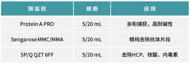 抗體主要包括單克隆抗體(單抗)、雙特異性抗體(雙抗)和其他功能性抗體(Fc融合蛋白、抗體藥物偶聯(lián)物(ADC)等),在疾病診斷、腫瘤和免疫性疾病治療等領(lǐng)域具有廣闊的應(yīng)用前景。為更好地滿足抗體快速、高效、低成本純化需求,中科森輝推出了高載量、高穩(wěn)定性的以蛋白A親和介質(zhì)為主的層析預(yù)裝柱組合套裝,為用戶提供便捷的一體化解決方案。