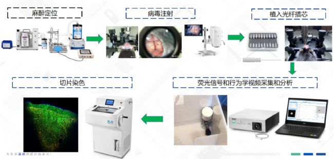 本章將幫你了解光纖記錄實驗中所包含的所有設備,包括麻醉定位、病毒注射、陶瓷插針埋植、熒光信號采集和分析,以及切片染色確認病毒注射位點位置。