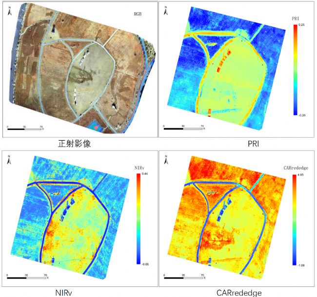 基于高光譜數(shù)據(jù)生成的植被指數(shù)可以定性和定量評價(jià)植被覆蓋及其生長活力,基于本次結(jié)果生成的PRI光化學(xué)反射指數(shù)可以評估植被的健康狀況,NIRv歸一化差異植被指數(shù)可以評估植被覆蓋度,CARrededge可用于估算類胡蘿卜素與葉綠素比值。