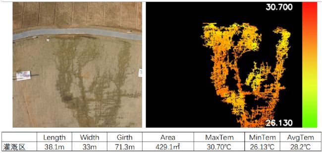 基于易科泰Thermo-RGB融合分析軟件,對地物中灌溉區(qū)進(jìn)行可見光與紅外熱成像數(shù)據(jù)融合分析處理,如下圖為掩膜顯示結(jié)果,并統(tǒng)計(jì)其形狀、面積和溫度等信息,可以精確反映不同地物覆蓋情況和溫度分布。