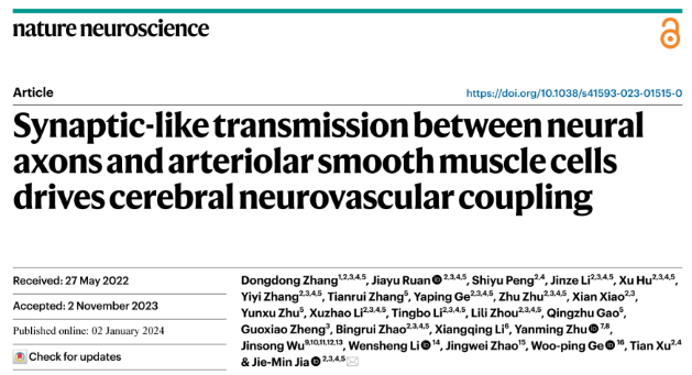 不久前,西湖大學(xué)賈潔敏團隊在Nature Neuroscience期刊上發(fā)表題為Synaptic-like transmission between neural axons and arteriolar smooth muscle cells drives cerebral neurovascular coupling的研究論文,該研究證實單個谷氨酸能神經(jīng)元軸突通過神經(jīng)-小動脈平滑肌細胞(arteriolar smooth muscle cells, aSMCs)連接之間的突觸樣傳遞來擴張其支配的小動脈。這一發(fā)現(xiàn)揭示了神經(jīng)元與腦血管直接對話的一座“新橋梁”,也為理解腦血流的快速和精準調(diào)控提供了一個全新的認知。