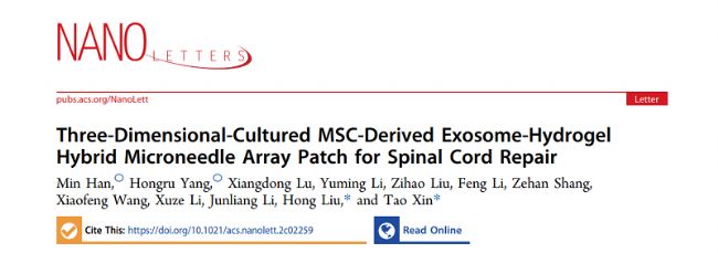Min Han ……& Tao Xin. (2022) Three-Dimensional-Cultured MSC-Derived Exosome-Hydrogel Hybrid Microneedle Array Patch for Spinal Cord Repair. Nano Letters.