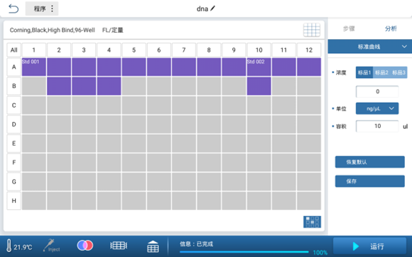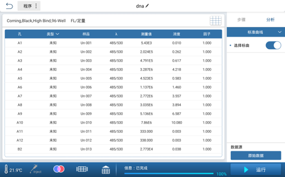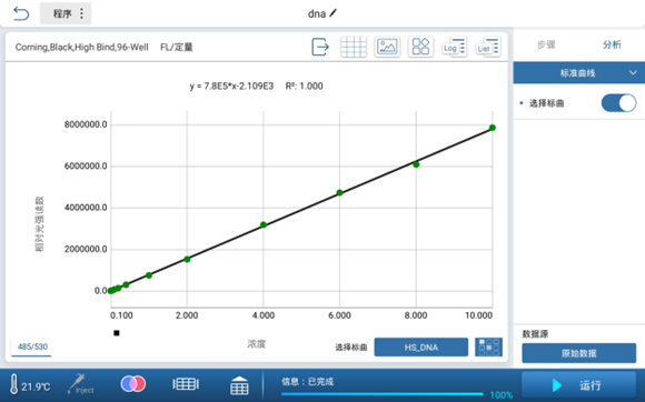 與這類試劑搭配最常見的儀器,應是熒光計和熒光酶標儀。常見的熒光計有Thermo的Qubit4和Qubit Flex,還有奧盛自有產品Fluo-200和Fluo-800,但熒光計的通量較少,最多只能做到8通道,若要同時進行8通道的樣品檢測,還需同時進行8通道的標品校準,非常浪費試劑。而選用熒光酶標儀作為檢測工具時,雖然檢測通量有所增大,但面臨著標準曲線建立的問題,由于熒光染料受環境的影響較大,因此在每次進行樣品檢測時,都需要重新建立一條標準曲線,若標曲線性不夠理想,還需重新配制標曲,增加實驗負擔。