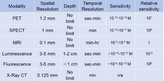 光學(xué)成像快速且易于執(zhí)行,與許多其他成像方式相比,相對(duì)便宜。此外,它非常敏感,能夠檢測(cè)到10-15 M范圍內(nèi)的分子事件。其主要缺點(diǎn)是穿透深度,在可見(jiàn)染料的情況下,穿透深度只有幾毫米。