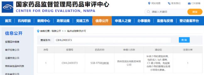 2024年6月24日,據CDE官網顯示,蘇州圣因生物醫藥有限公司(以下簡稱“圣因生物”)的1類新藥SGB-9768注射液獲得臨床試驗默示許可,適應癥為補體介導的腎臟疾病,包括成人 IgA 腎病、C3 腎小球病、免疫復合物介導的膜增生性腎小球腎炎患者。