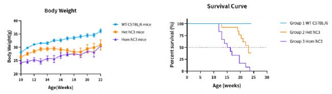 圖1. hC3小鼠的體重曲線及生存曲線。