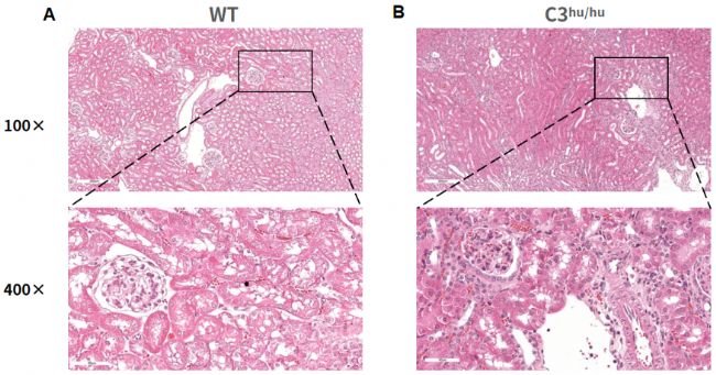 圖2. hC3純合子小鼠呈現出腎小球硬化、腎小球萎縮和毛細血管叢區炎癥的表型(100×和400×)。