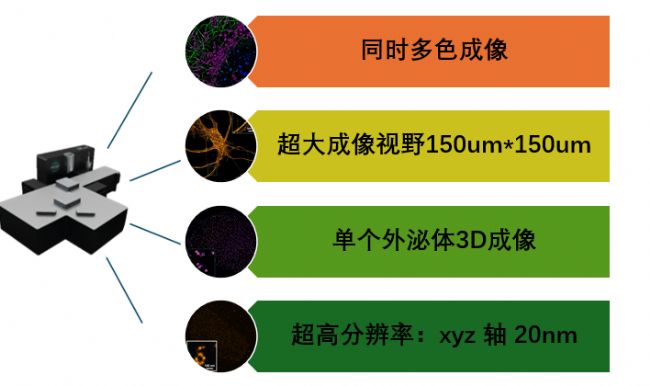 法國Abbelight公司研發推出的3D單分子超分辨成像系統,采用單分子定位技術(SMLM),輕松實現20 nm層級的超分辨成像。該系統可實現STORM、PALM和DNA-PAINT等多種成像功能,用于觀測細胞器結構和形態、不同細胞中的結構功能蛋白的分布以及共定位等信息。此外,還可以用于觀測外泌體或者納米顆粒,表征外泌體膜蛋白和其內容物的分布情況。通過其特有的ASTER技術,實現單次采集150 μm*150 μm超大視野成像和小視野的快速成像,可同時觀測多個細胞或者神經元,大大提升采集效率。