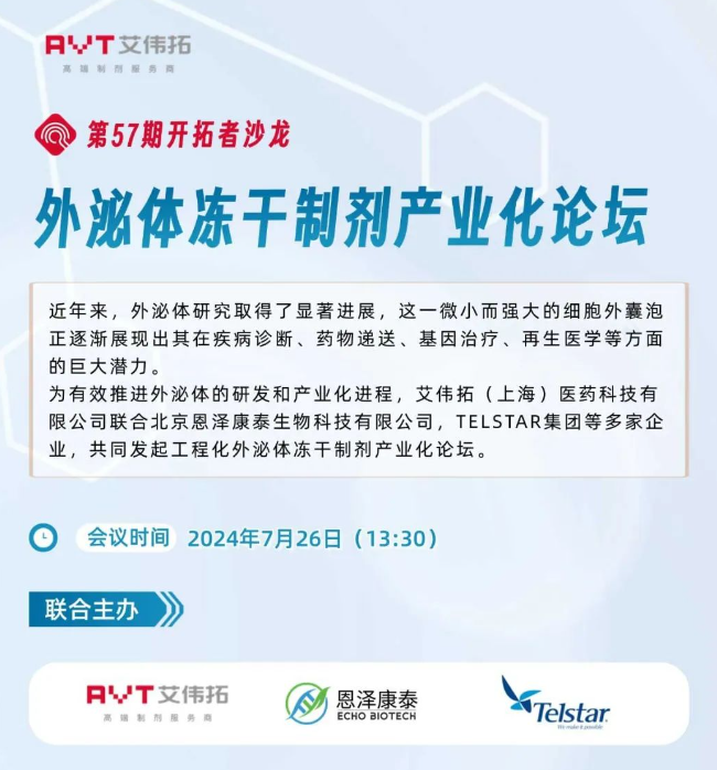 為有效推進外泌體的研發和產業化進程,艾偉拓(上海)醫藥科技有限公司聯合北京恩澤康泰生物科技有限公司,TELSTAR集團共同發起工程化外泌體研發和產業化論壇。