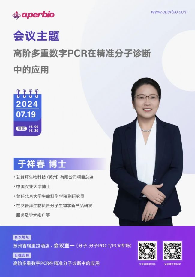 艾普拜生物于祥春博士將于7月19日16點(diǎn)會(huì)議室一(分子-分子POCT/PCR專場),基于數(shù)字PCR平臺(tái)和多種多重檢測技術(shù),跟大家分享主題為:高階多重?cái)?shù)字PCR在精準(zhǔn)分子診斷中的應(yīng)用,歡迎各位同仁專家學(xué)者蒞臨。